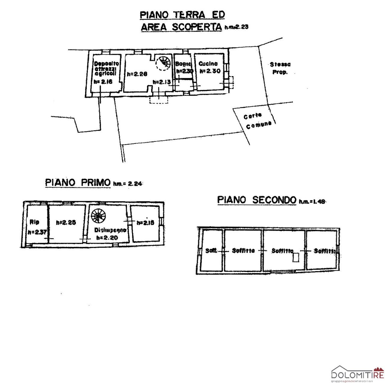 Al piano terra si trovano la cucina, il soggiorno, il bagno ed un deposito attrezzi, al piano primo vi sono un ampio disimpegno, due camere ed una stanza ad uso studio/guardaroba, al secondo piano si trovano quattro locali.