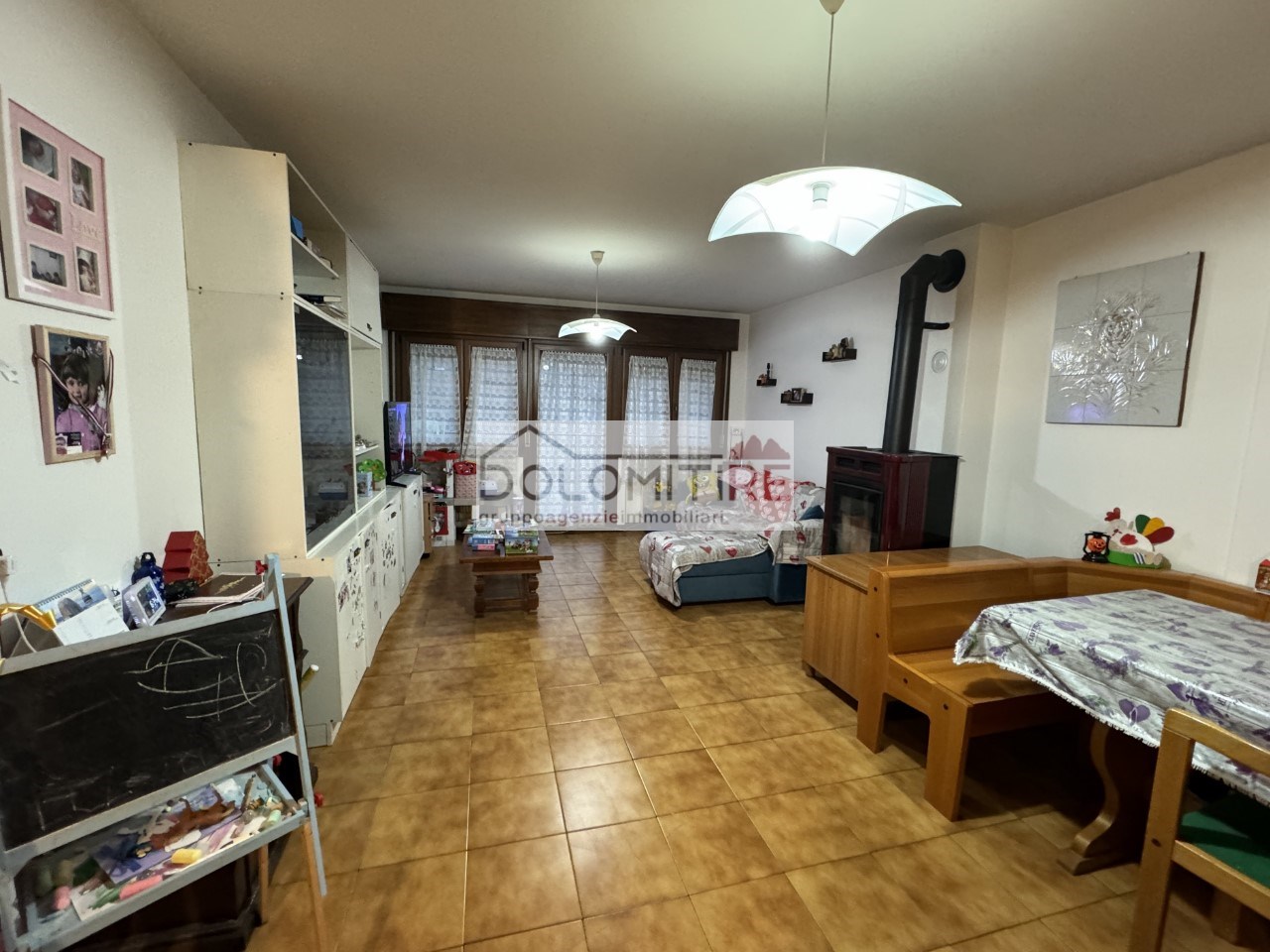 Appartamento al piano primo in buono stato di manutenzione, composto da ampio soggiorno - pranzo con angolo di cottura, tre camere, doppi servizi, grande terrazza perimetrale. Posto auto e cantina la piano interrato. Camino per stube, buona posizione comoda a tutti i servizi, adatto sia per residenza che seconda casa.
