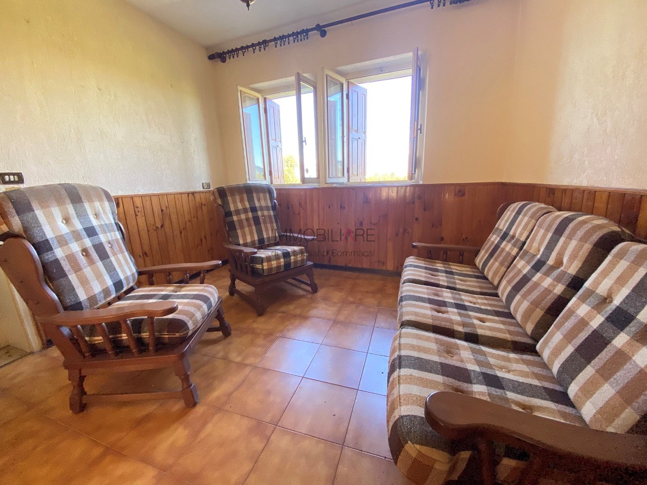 Il fabbricato è composto da un appartamento al P. T. composto da ingresso, ampio soggiorno, sbratta cucina, cucina e bagno, con quattro camere al P. 1° di cui una con terrazzo.